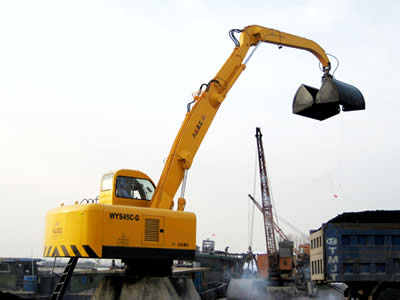 WYS42C-G型電動液壓固定式疊臂抓料機(jī)的回轉(zhuǎn)、卷揚、變幅及抓斗開閉作業(yè)等全部采用電動液壓驅(qū)動,先導(dǎo)控制。具有作業(yè)平穩(wěn)、各動作可無級調(diào)速;同等作業(yè)效率下可比內(nèi)燃機(jī)驅(qū)動節(jié)省60%能耗;司機(jī)室安裝冷暖兩用空調(diào)、多向調(diào)節(jié)座椅,作業(yè)環(huán)境舒適;配裝不同的液壓抓斗后均有自重小、抓取力大,對沙石、煤等散裝原料進(jìn)行抓取作業(yè)。 該固定式抓料機(jī)是港口、車站、碼頭等固定作業(yè)場所進(jìn)行散貨裝卸的最佳設(shè)備。